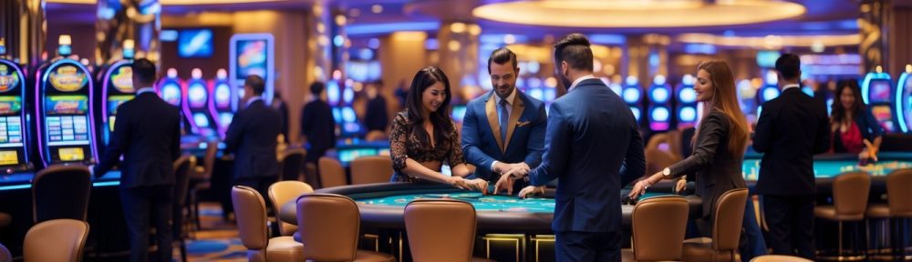 Suasana lantai kasino modern dengan meja permainan, mesin slot, dan orang-orang yang sedang berjudi.